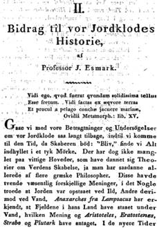 Esmark, J. 1824 Bidrag til vor Jordklodes Historie [Contribution to our Earth's history]. Magazin for Naturvidenskaberne v.2(1) p.29-54 http://www.google.com/books?id=zR0AAAAAMAAJ&pg=PA28